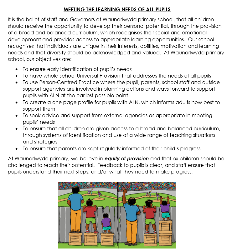 Universal Learning Provision is support that is available to all pupils at Waunarlwydd Primary School. Children may access this support in order to make progress in their learning, e.g. literacy and numeracy catch-up programmes. This support takes place in all classes and teachers closely monitor the children’s progress.